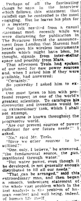 Our talk resulted from a casual statement made recently while we were discussing for publication in the Syracuse Herald the announcement from London that Marconi had heard upon his wireless instruments sounds which might have been, he thought, signals from inter-stellar space and possibly from Mars.