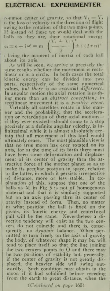This article from the June, 1919 issue of The Electrical Experimenter is a follow-up to Nikola Tesla's articles, "Famous Scientific Illusions," and "The Moon's Rotation," published in The Electrical Experimenter in February and April of the same year.