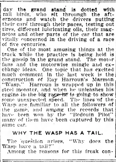 day the grand stand is dotted with rail birds, who sit through the afternoons and watch the drivers putting their cars through their paces, testing out tires, different lubricating oils, their magnetos and other parts of the car that are vitally concerned in the driving of a race of five centuries.One of the most amusing things at the track while the practice is being held is the gossip in the grand stand. The motor fans and the motorwise mingle and exchange ideas. One topic that has excited much comment in the last week is the construction of Ray Harroun's Marmon "Wasp." Harroun is wrapped up in this steel monster, and when he unleashes his engine in the big race he is going to show some unexpected speed. The lines of the Wasp are familiar to all the followers of the game, and among the records that have been won by the "Bedouin Pilot" many of them have been captured by this same car.